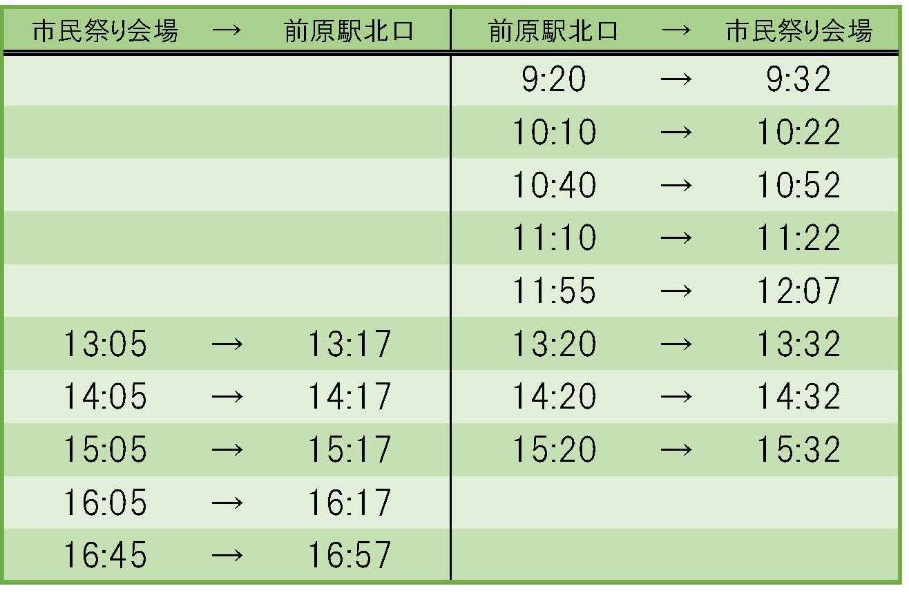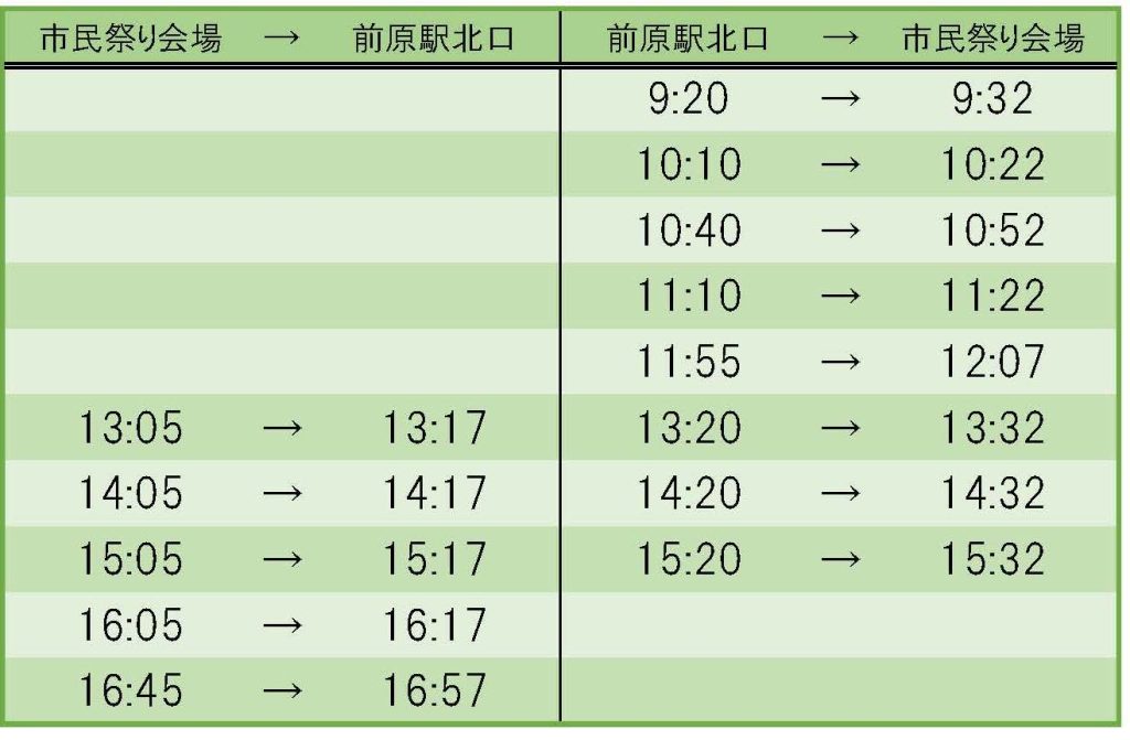 2025年9月4日 / 最終更新日時 : 2025年9月4日 staff 新着情報 【2025】糸島市民まつり 臨時バス時刻表 会場と前原駅北口を結ぶ臨時バスの時刻表です。 運賃は片道240円です。 市民まつり開催期間中(2025年10月4日(土)~10月5日(日))に運行 されます。混雑が予想されますので、ぜひ便利な臨時バスをご利用ください。